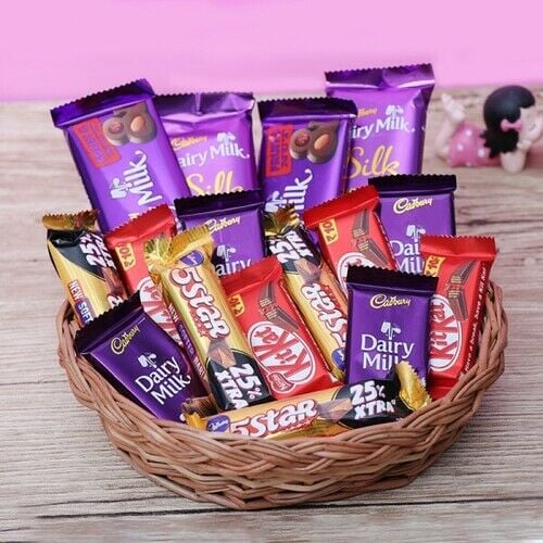 Cane Basket with 4 Dairy Milk Chocolate (13.2 gm), 4 kitkat Chocolate (13 gm), 4 Five Star Chocolate (22.4 gm), 2 Dairy Milk Silk (60gm) and 2 Dairy Milk Fruit and Nut (40 gm)