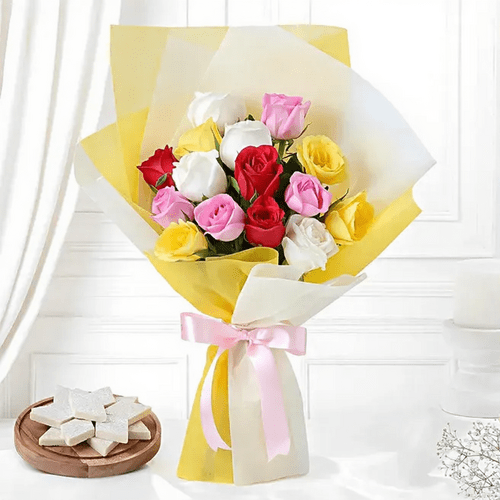 A vibrant celebration of colour and sweetness this gift combines the charm of roses in yellow white revival pink and red for a bouquet full of warmth and elegance. Wrapped in soft yellow and off white paper and finished with a pink satin ribbon it carries both freshness and style. To complete the gesture rich saffron kaju katli adds a traditional indulgent touch making this gift ideal for festive occasions heartfelt thanks or special celebrations. Its a perfect blend of floral beauty and sweet delight.