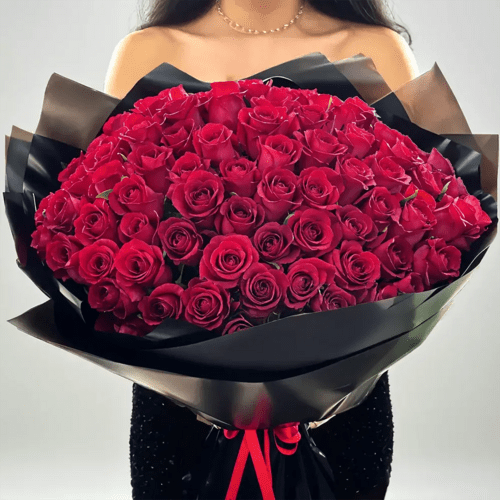 This bouquet of 100 fresh red roses is the perfect way to show your love and affection. The roses are fresh and vibrant, and they will last for days. The bouquet is wrapped in black paper, and it has a red ribbon.