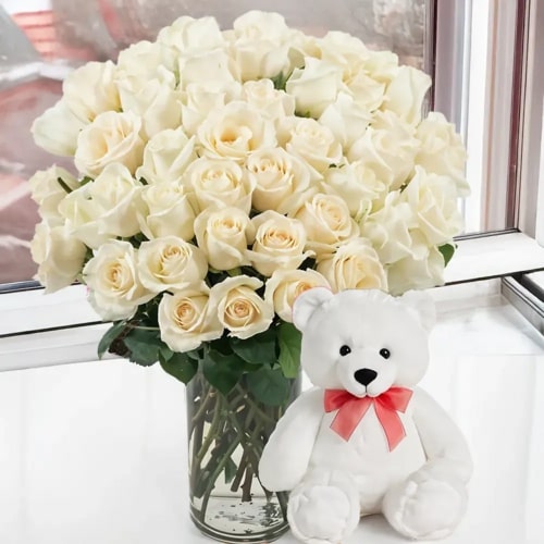 This exquisite gift of 50 white roses in a vase and a cuddly 12 inch teddy bear is a timeless expression of purity, innocence, and everlasting love. The white roses symbolize the purest of human emotions, while the teddy bear adds a touch of affection. The receiver will cherish this gift for years to come, as a reminder of your love and devotion.