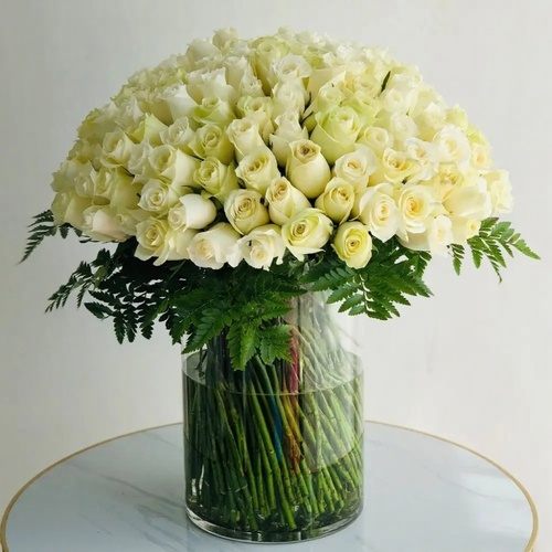 100 white roses with green fillers arranged in a glass vase