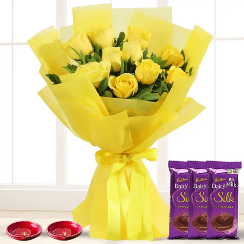 A bouquet of 10 yellow roses with kamini leaves in yellow wrapping with a yellow ribbon & 3 Dairy Silk Chocolates