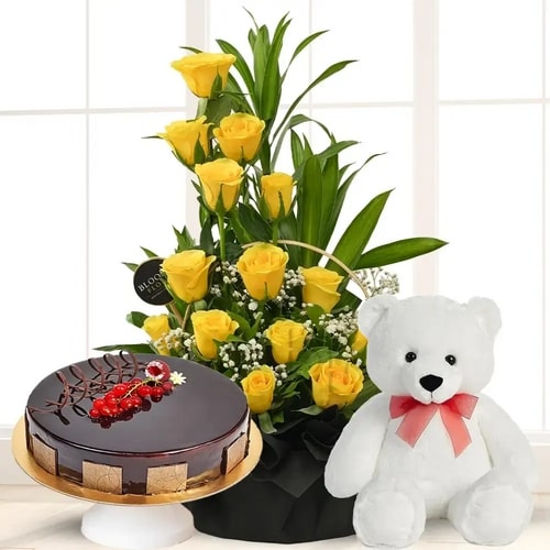 Brighten their day with our delightful Basket of 25 yellow Roses, complemented by lush greens for a fresh touch. Adding sweetness to the mix, a 1/2 kg Chocolate Cake is included, and to wrap it all in warm hugs, a 12-inch Teddy Bear is ready to make any occasion extra special.